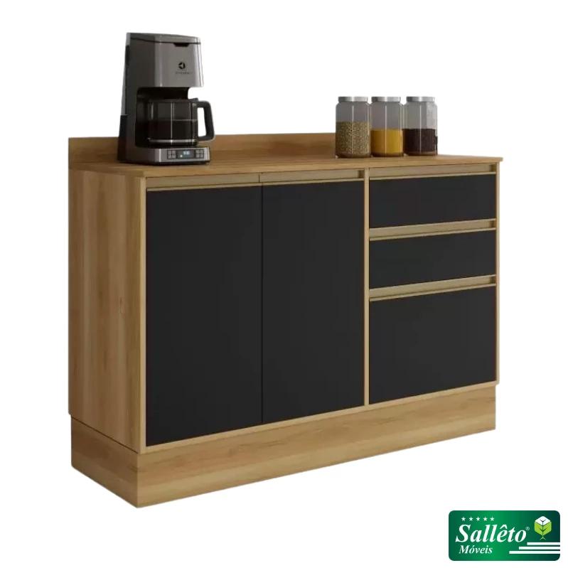 Estrutura 100% MDP em Chapas de 15mm, 3 Portas de Bater com Dobradiças Metálicas, 1 Prateleira Interna, 2 Gavetas com Corrediças Metálicas, Puxadores de Polipropileno, Pés Reguláveis com Rodapé de PVC Remóvível.