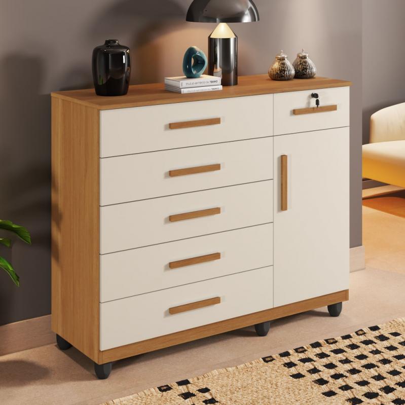A Cômoda Milão é produzido em chapa de 15 mm que garante robustes e maior vida útil , contem 1 porta, 1 prateleira, 6 gavetas sendo 1 com chave, com corrediças telescópica, pés incluso no produto e puxadores na cor , ótimo custo beneficio. Com design elegante e amplo espaço, ela organiza seus pertences com estilo. Feita em MDP de alta qualidade, garante durabilidade e se adapta a qualquer decoração. Perfeita para transformar seu ambiente!