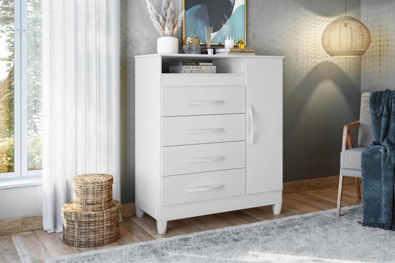 Descubra a cômoda perfeita para seu quarto! Com 4 gavetas e 1 porta, esta peça em MDP oferece organização versátil e estilo. Os puxadores metalizados brilham com sofisticação, enquanto os pés inclusos garantem estabilidade e um design moderno. Prática, durável e cheia de charme, ela é o toque que faltava no seu espaço!