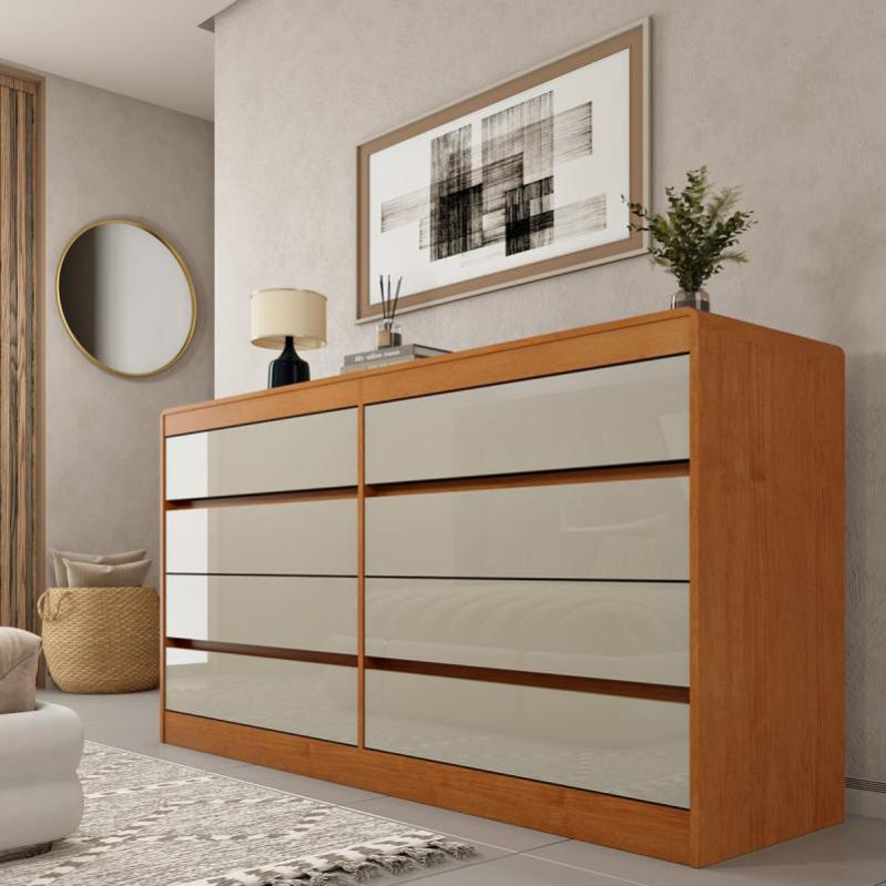 A Cômoda Espanha com 8 gavetas, cantos arredondados e sem puxadores, é um modelo de 100% MDF projetado para organização de quartos casal. Ela apresenta um design moderno com linhas curvas e molduras.