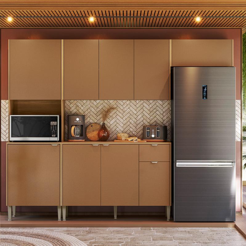Estrutura 100% MDP 12mm e 15mm. 5 Portas Superiores Passantes de Bater com Dobradiças Metálicas Slow Motion, sendo uma Basculante com Amortecedor a Gás, 4 Portas Inferiores Embutidas com Dobradiças Metálicas Slow Motion, 1 Gaveta com Corrediças Metálicas Telescópicas, Portas Inferiores e Gaveta com Puxadores Ergonômicos de Alumínio, 4 Pateleiras Interrnas, Nicho para Fornos Elétricos com Passa Fios, Amplo Espaço sobre o Balcão para Eletrodomésticos e Utensílios Culinários, Pés Reguláveis Plásticos de Poliestireno, Acabamento em Pintura UV Semi-Brilho Texturizada.