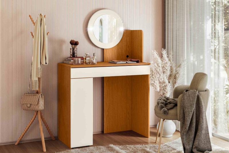 Esta Camarim em MDP é o sonho de quem ama praticidade e estilo: com 2 luminárias de LED, gaveta espaçosa e espelho redondo, ela transforma seu espaço em um camarim de luxo. Ideal para realçar sua beleza e organização!
