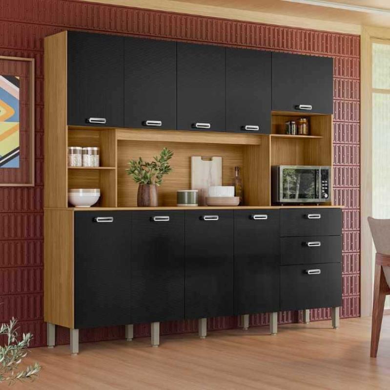 Estrutura 100% MDP m12mm e 15mm. 10 Portas de Bater com Dobradiças Metálicas, 2 Gavetas com Corrediças Metálicas Telescópicas, 2 Prateleiras Internas, 5 Nichos Externos: 1 Superior Horizontal para Potes e Temperos, 2 Verticais para Utensílios Culinários e/ou Itens Decorativos, 1 Nicho para Fornos Elétricos com Passa Fios e 1 Amplo sobre o Balcão para Eletrodomésticos e Demais Itens Cluninários, Puxadores Ergonômicos de Poliestireno, Pés Plásticos Reguláveis de Poliestileno e Acabamento em Pintura UV Semi-Brilho Texturizada.