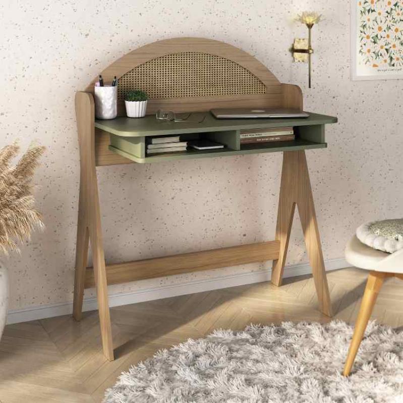 Estrutura MDF/MDP 15mm, Tampo com Cantos Frontais Curvos, 2 Nichos Externos para Livros e Utensílios, Espelho em Meio Arco com Detalhe em Treliça de Palha em Pintura 3D, Pés de MDF 25mm com Sapatas Plásticas