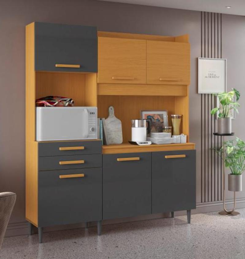 Estrutura 100% MDP 12mm e 15mm, 06 Portas de Bater com Dobradiças Metálicas, 2 Gavetas com Corrediças Metálicas, Puxadores de Perfil em MDF, Nicho Externo para Fornos, Amplo Espaço sobre o Balcão para Eletrodomésticos e Utensílios Culinários, 1 Prateleira Interna, Pés Plásticos de PVC e Acabamento em Pintura UV Alto Brilho.